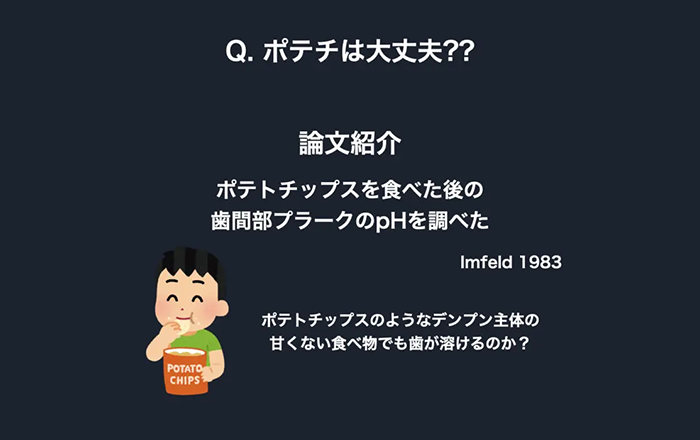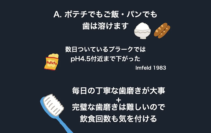 ポテチ・ご飯・パンのようなデンプン主体のものを摂取しても虫歯になる可能性があるということがわかります。