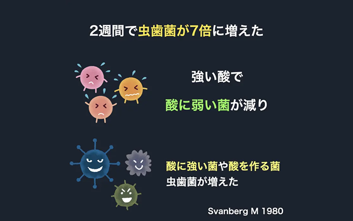 論文によると酸で洗口すると2週間でおよそ7倍に虫歯菌が増えています