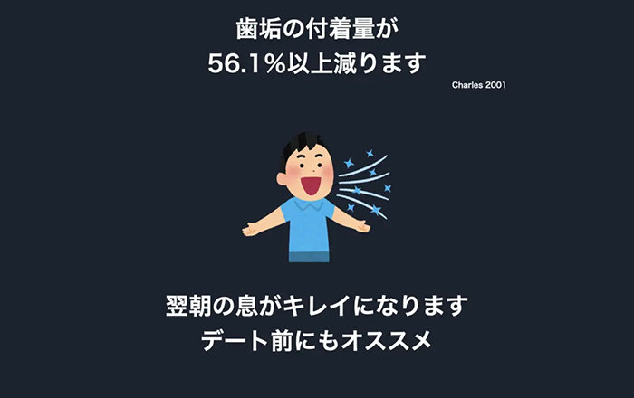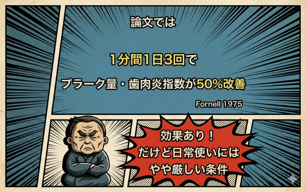 現実的には、1日2回30秒ずつくらいでしょうか。そうすると歯肉炎の改善は20%です。