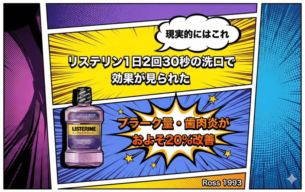 例えば、リステリンを1日3回1分ずつ使えば歯肉炎は50%改善しますが、実際にはその回数を毎日使い続けるのは難しいと思います