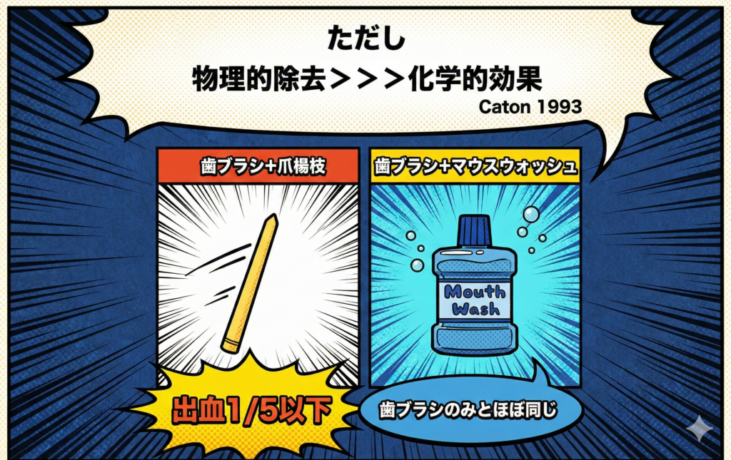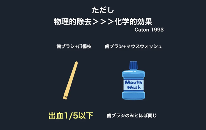 画像で紹介しているように歯ブラシとマウスウォッシュを使っても歯ブラシと同じくらいしか効果がなかったとする論文もあります