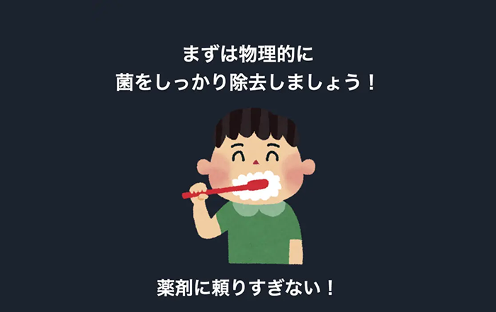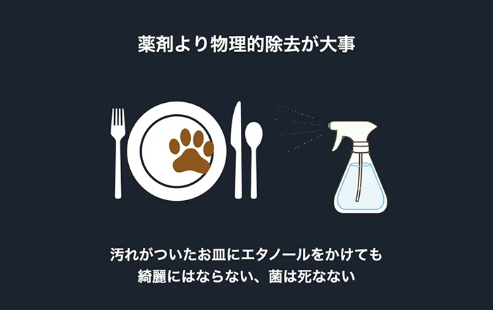 生ゴミ・汚れにエタノールをかけても雑菌が繁殖するのと同じように、大事なのは物理的な除去です