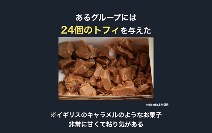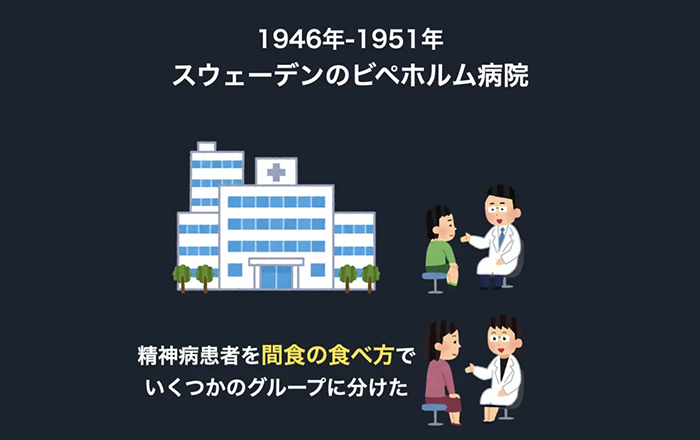 精神病患者に糖分を与えて、どの糖分が虫歯になりやすいか、いつ食べると虫歯になりやすいかを調べた研究なので