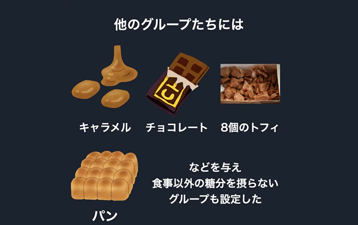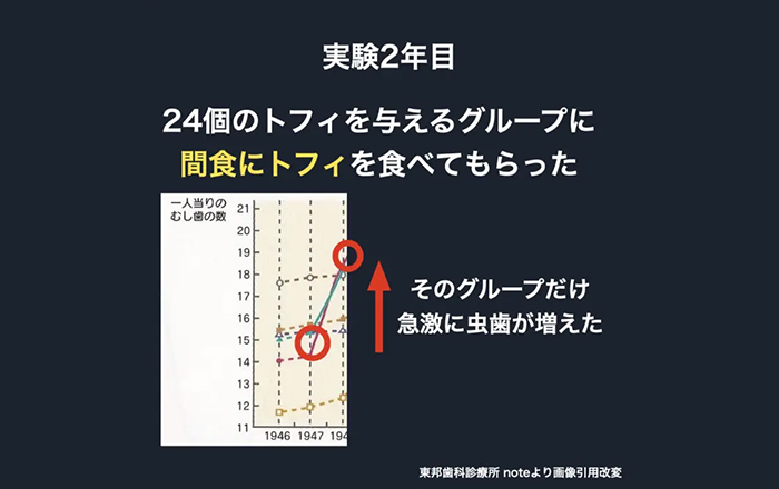 そうすると、食間に食べたグループはどんなものを与えても虫歯が増えました