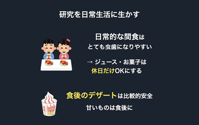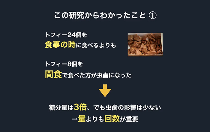 食べるタイミングが違うだけで同じ食べ物でも虫歯の発生数が変わることから、口の中に食べ物を入れている時間が長いことが歯にとってよくないことがわかります