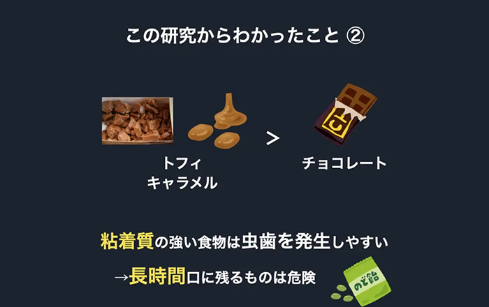 歯につきやすい食べ物(トフィ>キャラメル>チョコレート)は口に残る時間が長いため虫歯になりやすく