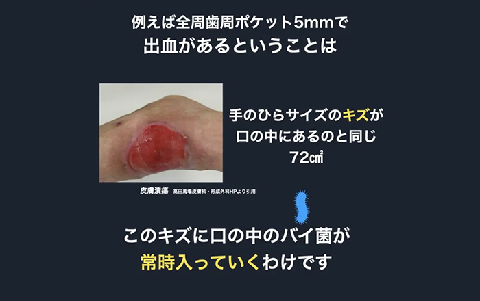 歯周ポケットが全周5mmある人で出血がある場合、全て合わせると手のひらサイズのバリアが破壊されています