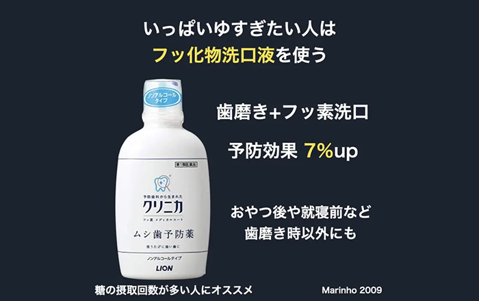どうしてもゆすがないと気持ち悪いという方にはフッ化物洗口液をおすすめしてます!