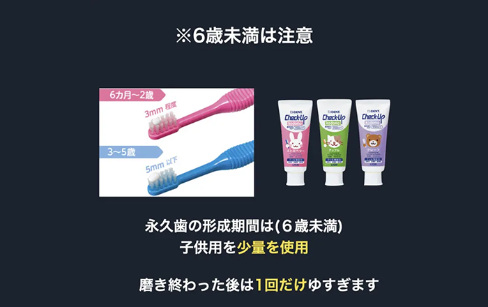 6歳未満の方は「フッ素症」の恐れがありますので、歯科医師の指導のもとフッ素を適切に使用してください!