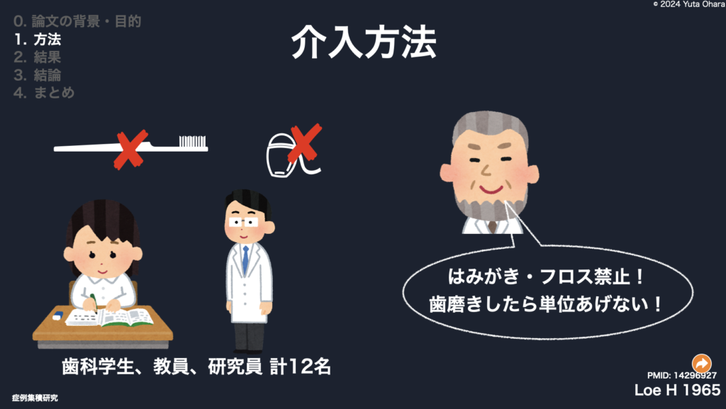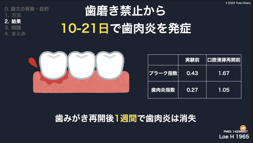 📝 Löeらによる有名な研究では、健康な人の歯磨きを意図的に中断したところ、10〜21日で全員に歯肉炎が発症しました。 ✨ しかし、歯磨きを再開すると、その歯肉炎はわずか1週間ほどで元通りキレイに治ったのです。
