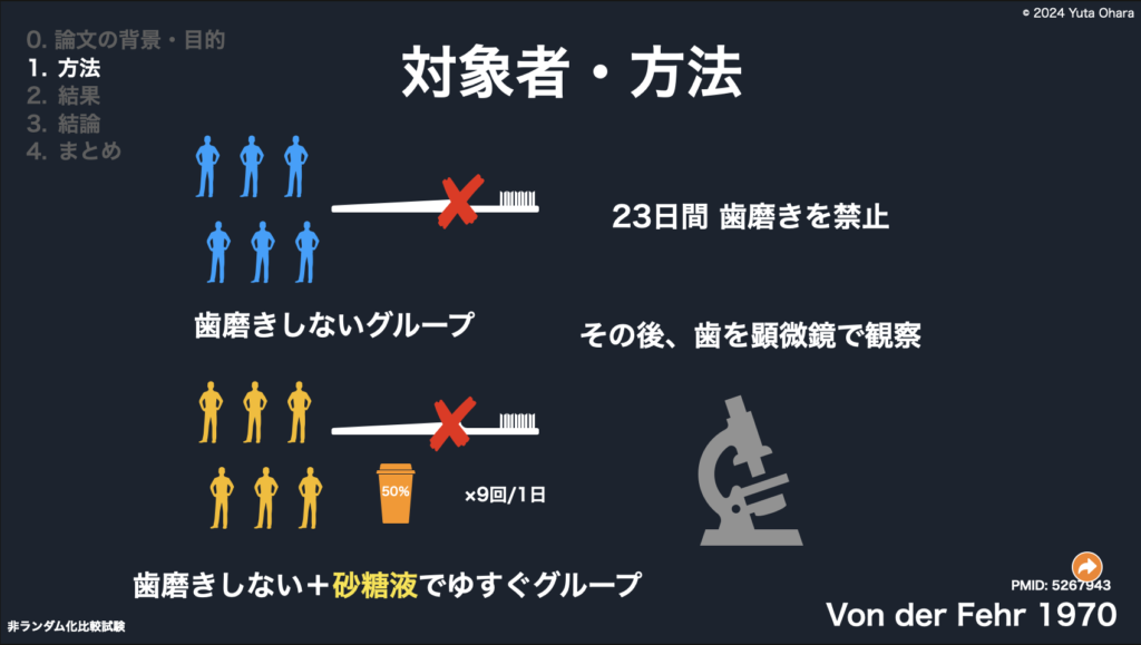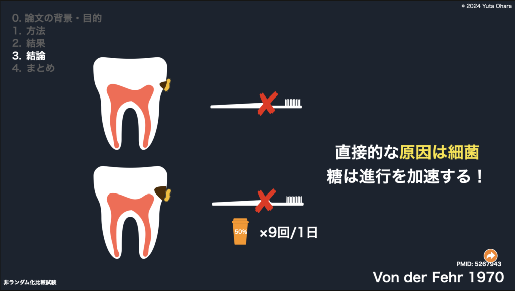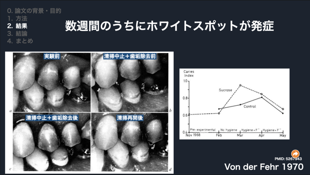 📝 von der Fehrらの有名な研究では、歯磨きを中止し砂糖水を頻繁に口に含むと、わずか3週間で初期虫歯が発生しました。