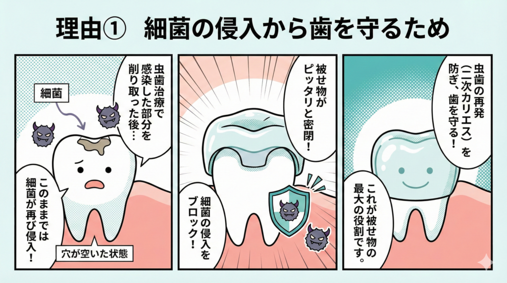 虫歯を削った後は、そのままにしておくわけにはいきません。被せ物や詰め物で削った部分を修復するのには、主に次の2つの大切な理由があります。