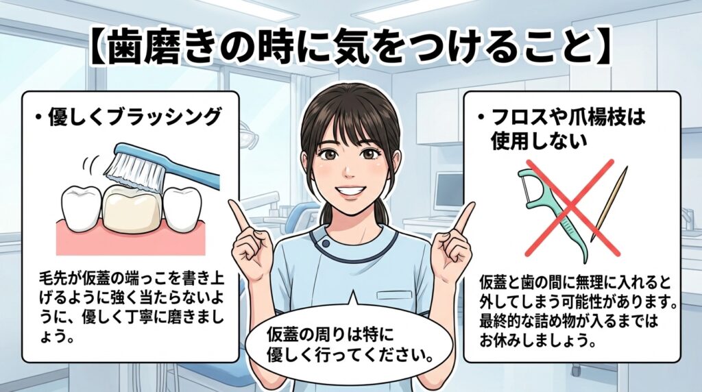 歯磨き通常通り行っていただいて構いませんが、仮蓋の周りは特に優しく行ってください。