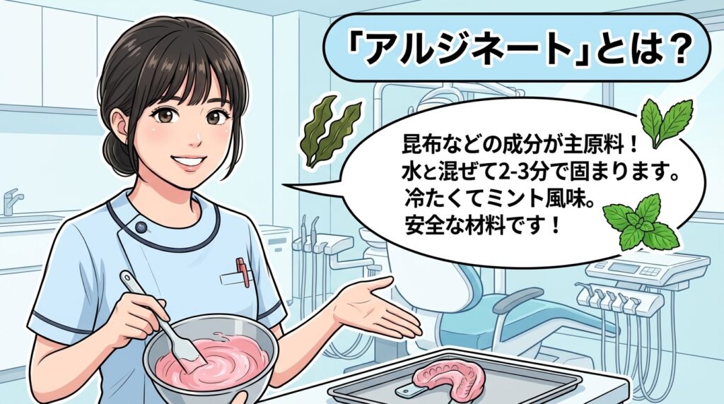 型取りに最も一般的に使用されるのが、「アルジネート(アルギン酸塩印象材)」という材料です。これは、昆布などの階層から抽出させる成分を主原料としており、ペースト状にして使います。