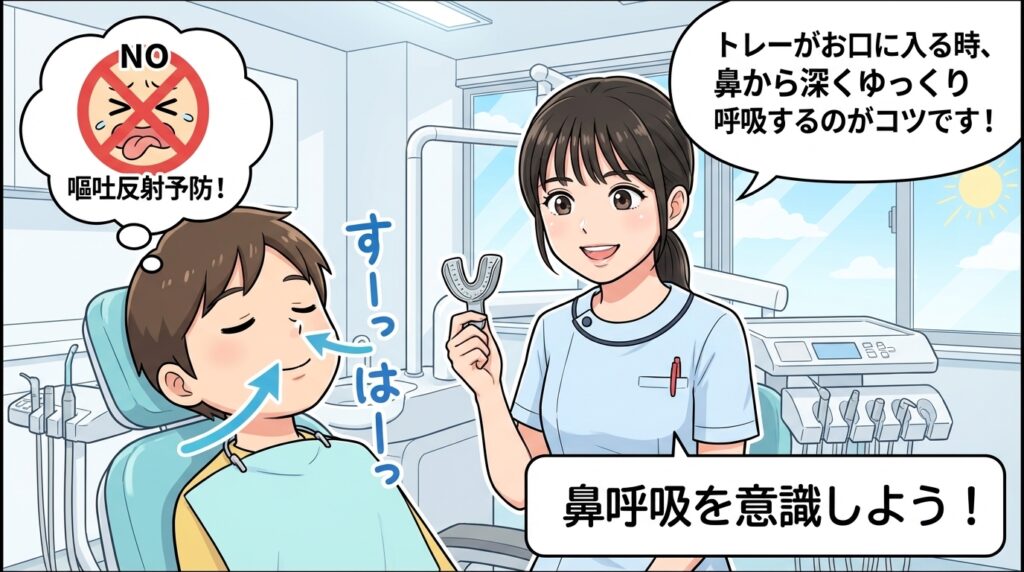 トレーがお口に入ることで。特に奥歯の型をとる際は、喉の近くまで材料が届くため、嘔吐反射(「オエッ」となること)が出やすい場合があります。嘔吐反射を予納するためには。鼻から深く、ゆっくりと息を吸い、鼻から吐く「鼻呼吸」に集中するのが効果的です。