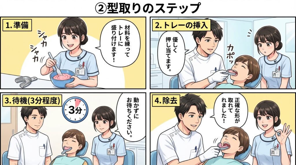 型取りで使用する材料や、具体的な流れをご紹介します。どんなことをするのか事前に理解していただくことで、少しでもリラックスしていただけますと幸いです。