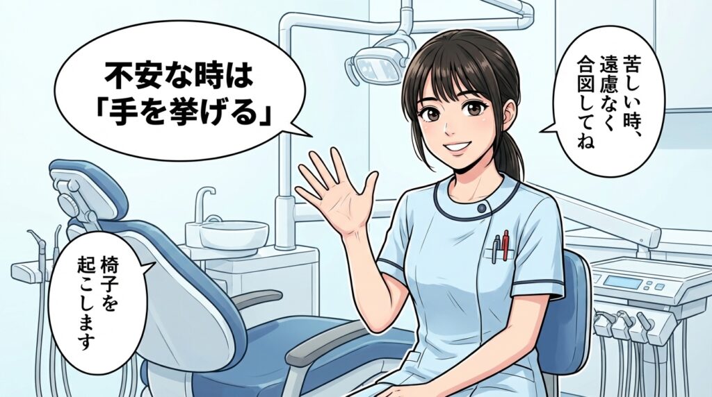 「苦しい」「気持ち悪い」「どうしてもオエッとなりそう」という時は、無理に我慢せず、遠慮なくて手を挙げて合図してください。