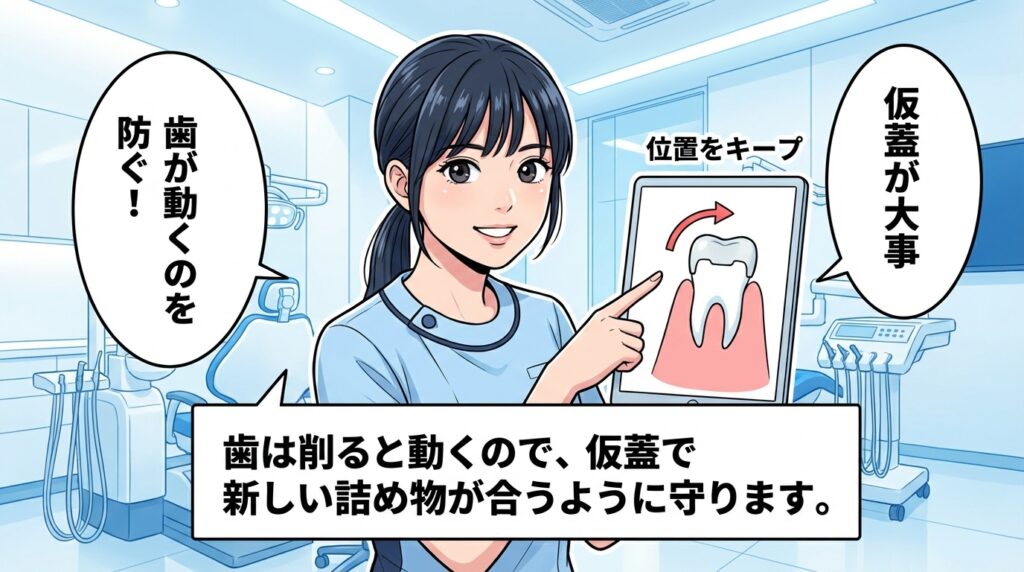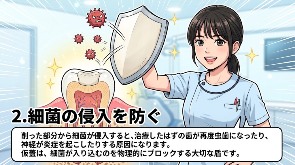 削った部分から細菌が侵入すると、治療したはずの歯が再度虫歯になったり、神経が炎症を起こしたりする原因になります。仮蓋は、細菌が入り込むのを物理的にブロックする大切な盾です。