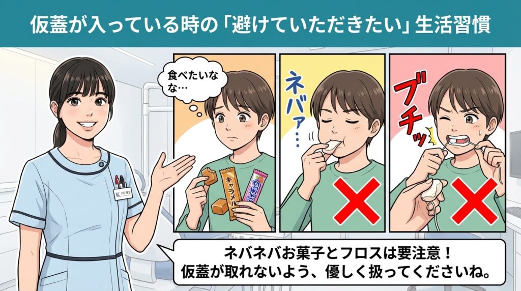 仮蓋が入っている数日間は、日常生活の中で少し意識していただくことで、蓋が取れるリスクを大幅に減らすことができます。