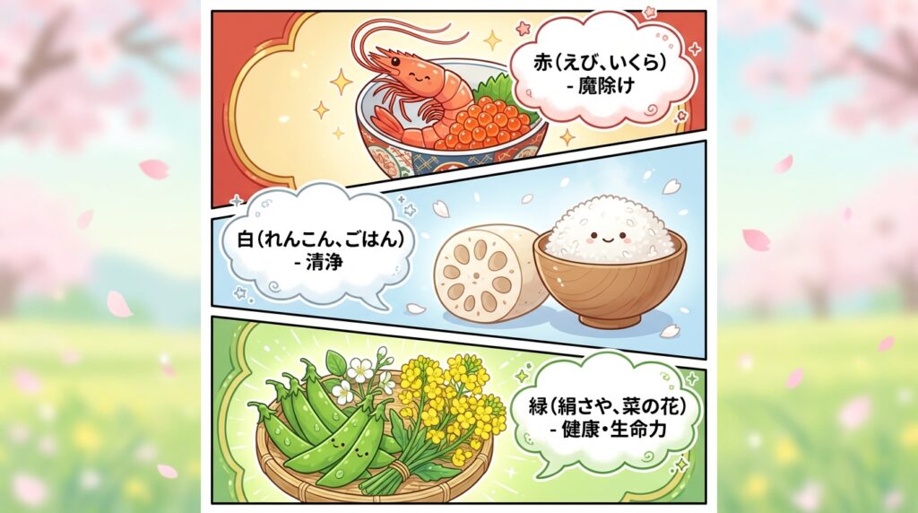 ちらし寿司の鮮やかな彩りは、そのまま春の情景を表していると言われています。