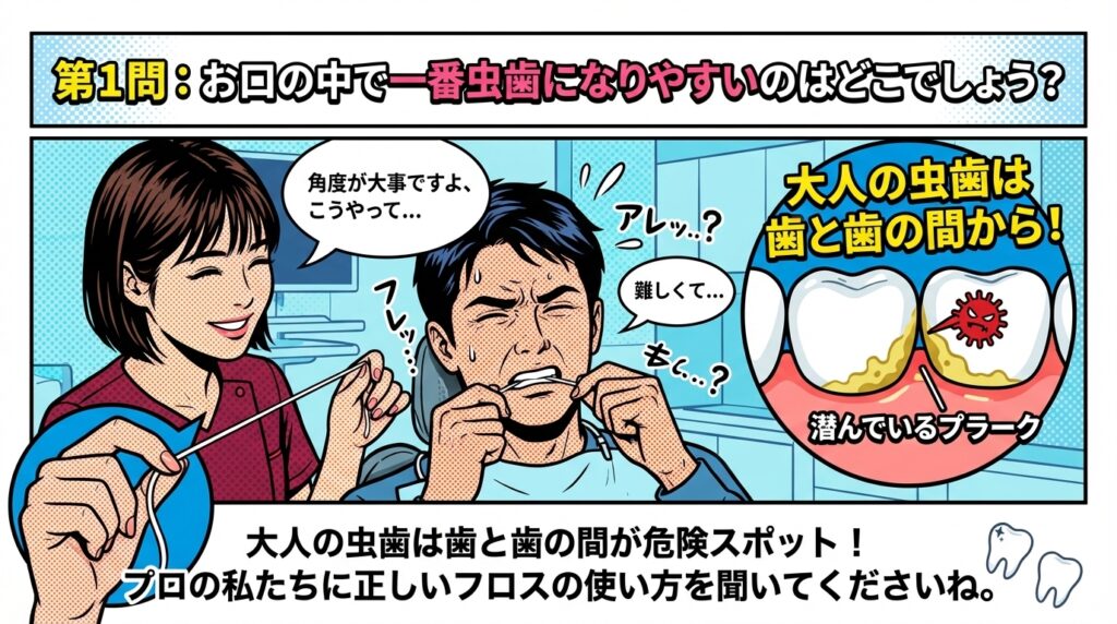 【第1問:お口の中で一番虫歯になりやすいのはどこでしょう?】