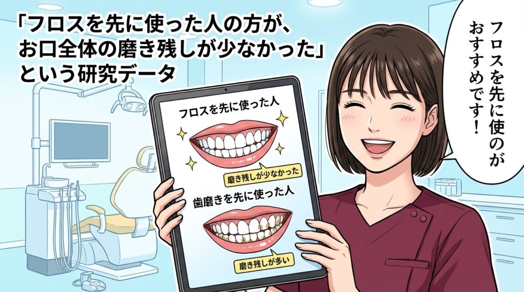 もちろん「絶対に歯の間から磨かないと虫歯ができる」というわけではありません。ですが、実際に「フロスを先に使った人の方が、お口全体の磨き残しが少なかった」という研究データもあるんです。