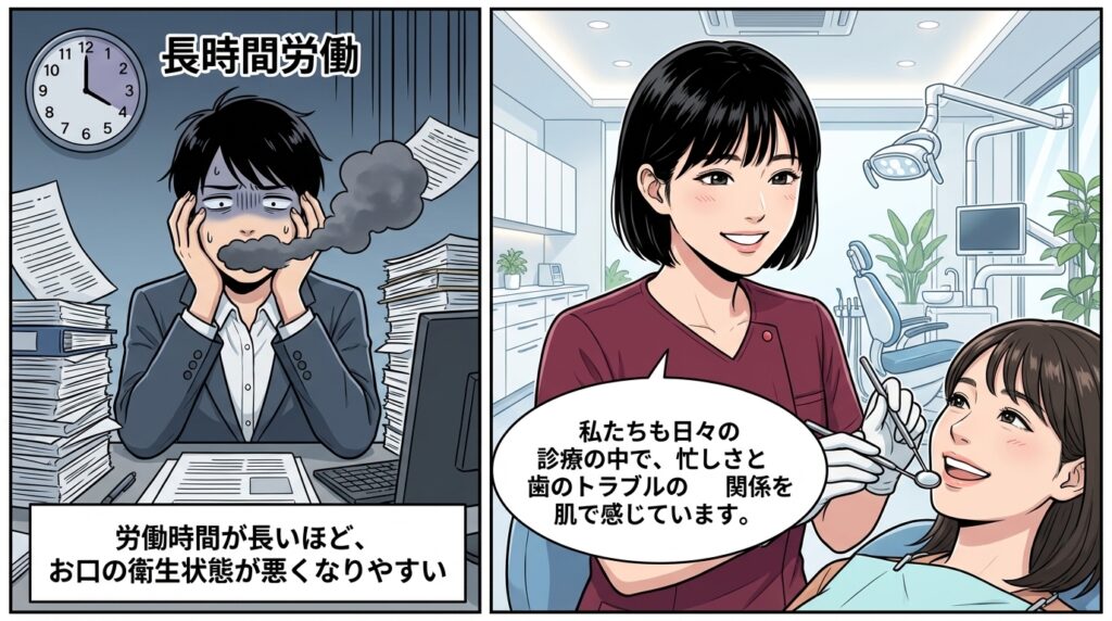 実は「労働時間が長いほど、お口の衛生状態が悪くなりやすい」という研究データがあるほど、忙しさと歯のトラブルは深く関係しています。私たちも日々の診療の中で、そのことを肌で感じています。