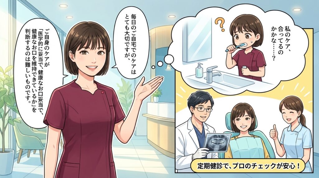 毎日のご自宅でのケアはとても大切ですが、ご自身のケアが「医学的に妥当で、健康なお口を維持できているか」を自分で判断するのは難しいものです。