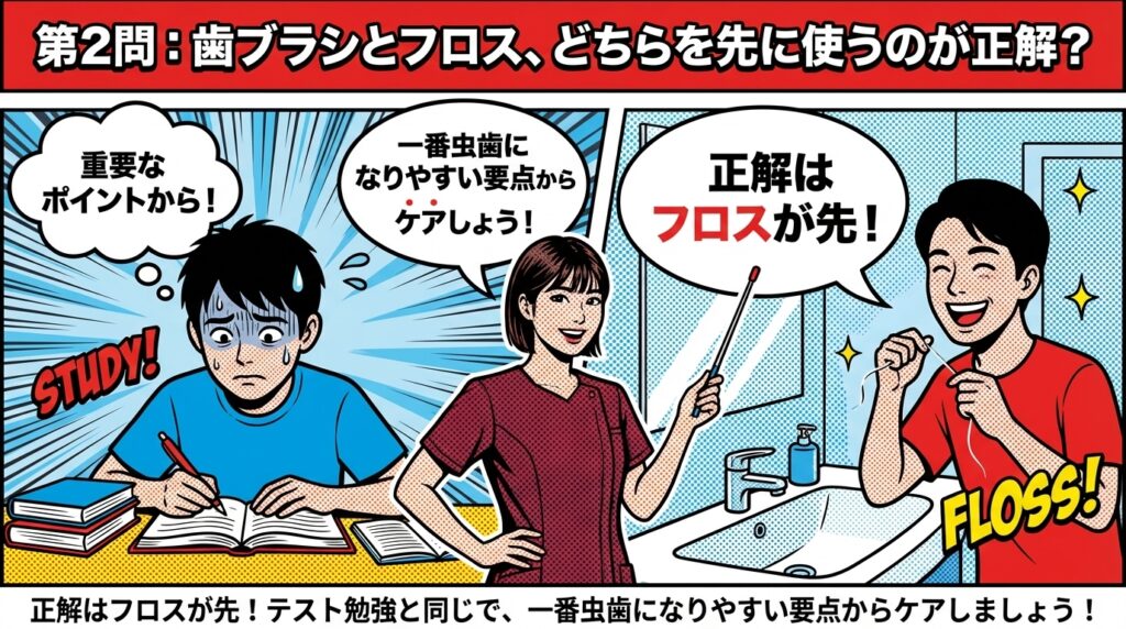 【第2問:歯ブラシとフロス、どちらを先に使うのが正解?】