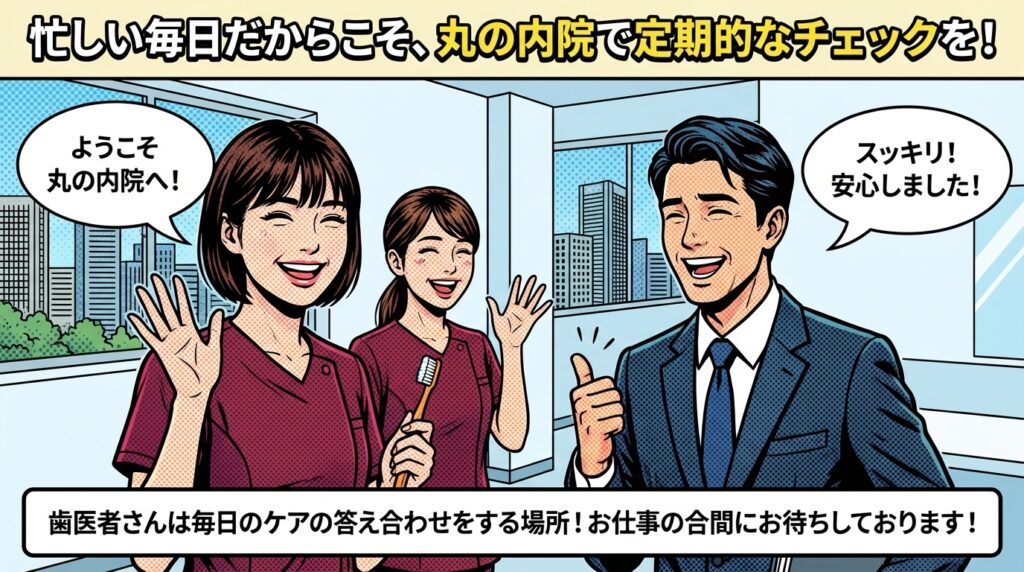 毎日お仕事を頑張るビジネスマン・ビジネスウーマンの皆さまは、お忙しくてなかなかご自身のお口の健康にまで意識を向けるのが難しいですよね。