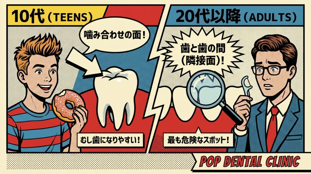 10代のうちは「歯の噛み合わせの面」が虫歯になりやすいのですが、20代以降の大人になると「歯と歯の間(隣接面)」が最も虫歯になりやすい危険なスポットになるんです。
