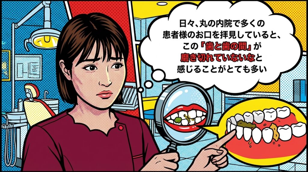 日々、丸の内院で多くの患者様のお口を拝見していると、この「歯と歯の間」が磨ききれていないなと感じることがとても多いです。