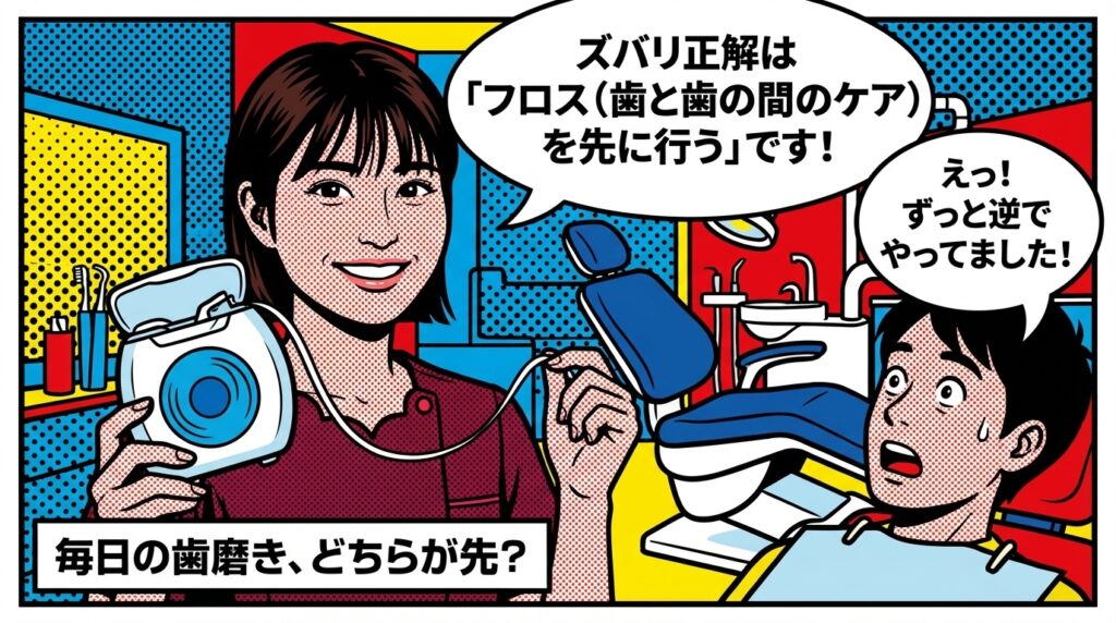 診療室でこのお話をすると、多くの患者様から「えっ!ずっと逆でやってました!」と驚きの声をいただきます。歯ブラシで全体を磨いてから、仕上げにフロス…というイメージを持っている方がとても多いんですよね。