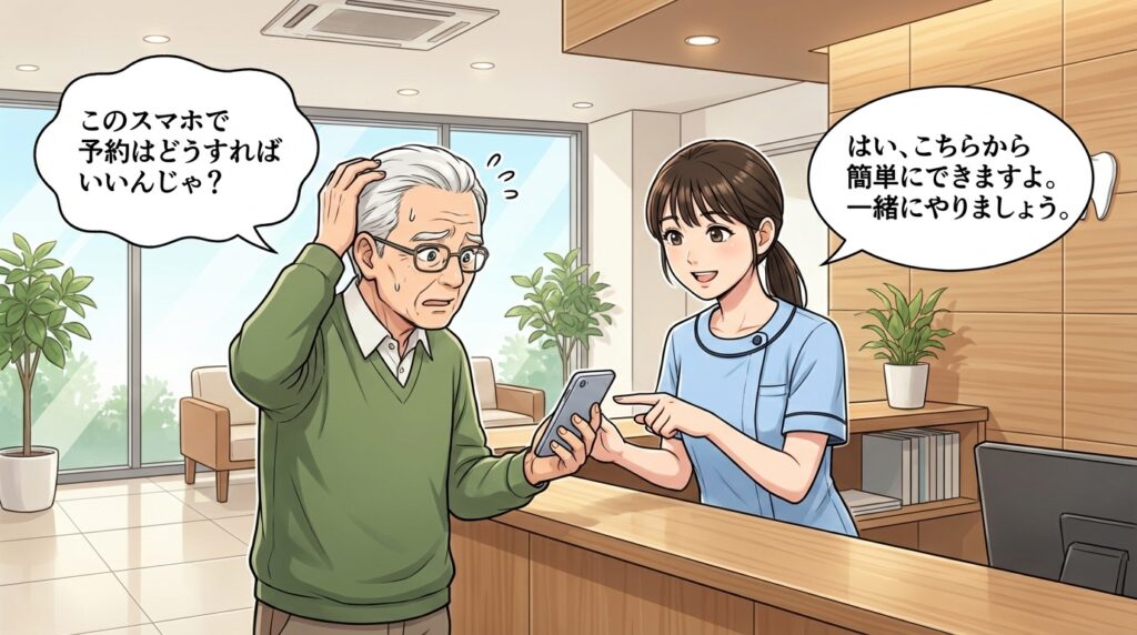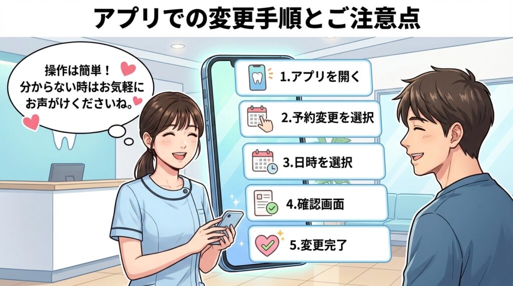 たったこれだけで、ご予約の変更が完了します。「スマートフォンの操作が少し苦手…」という方は、ご来院時に受付スタッフが丁寧にご案内しますので、どうぞお気軽にお声がけくださいね。