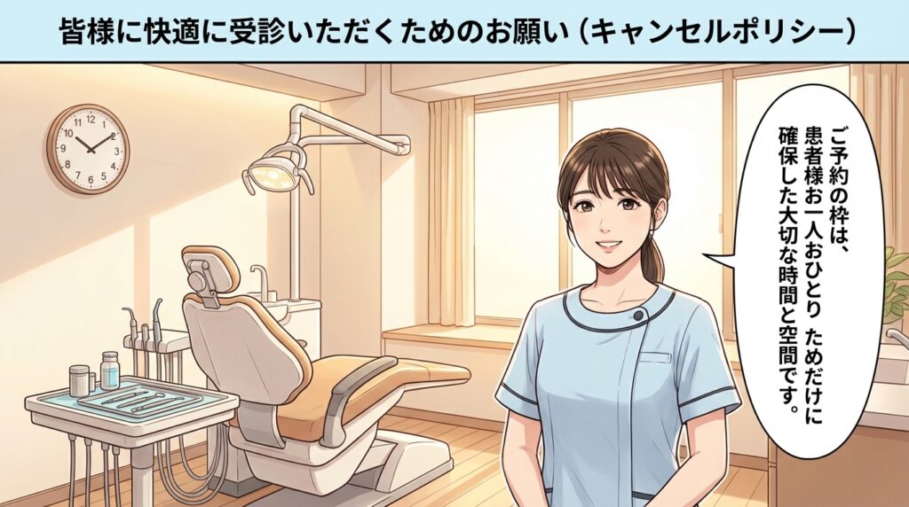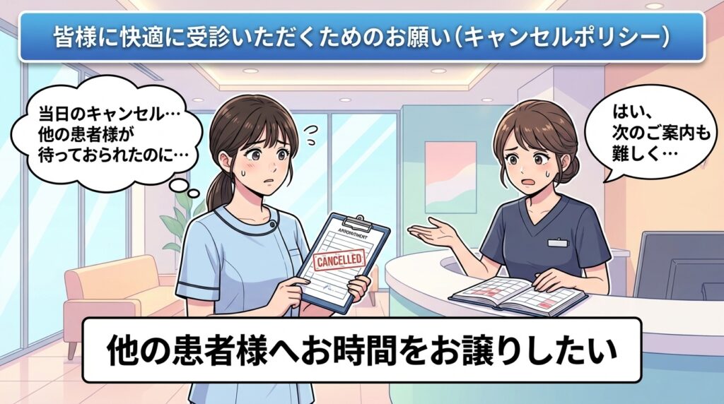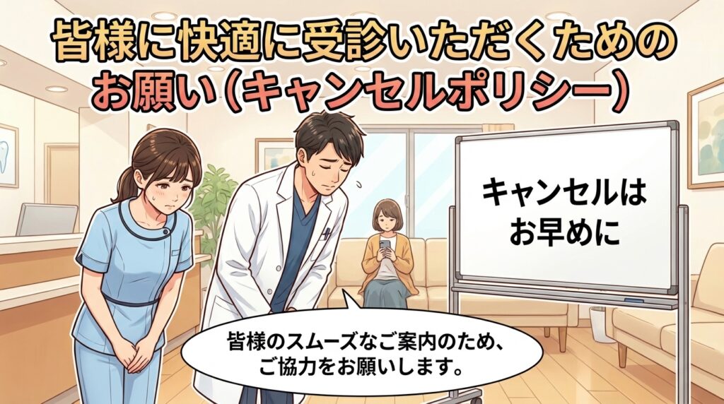 当院では、すべての患者様にしっかりと治療の時間を確保し、スムーズにご案内できるよう「キャンセルポリシー」を設けさせていただいております。