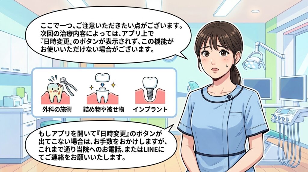 次回の治療内容によっては、アプリ上で「日時変更」のボタンが表示されず、この機能がお使いいただけない場合がございます。