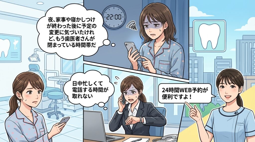 これまでは「日中忙しくて電話する時間が取れない」「夜、家事や寝かしつけが終わった後に予定の変更に気づいたけれど、もう歯医者さんが閉まっている時間帯だ」とお困りになることもあったかと思います。