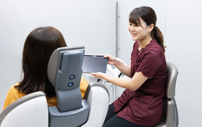 撮影した写真を使って治療説明を行い、患者様の口腔がどのように変化していくかを記録します。