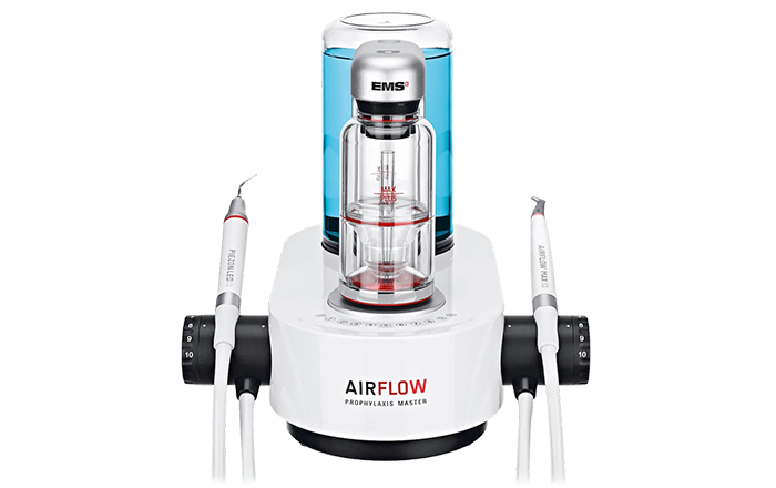 当院ではスイスEMS社製の最新機器「エアフロー プロフィラキシス マスター」を使用し、バイオフィルムやステイン、歯石の除去などを行っています。エアフローは細かなパウダーを噴射して着色やバイオフィルムをやさしく除去できる方法です。