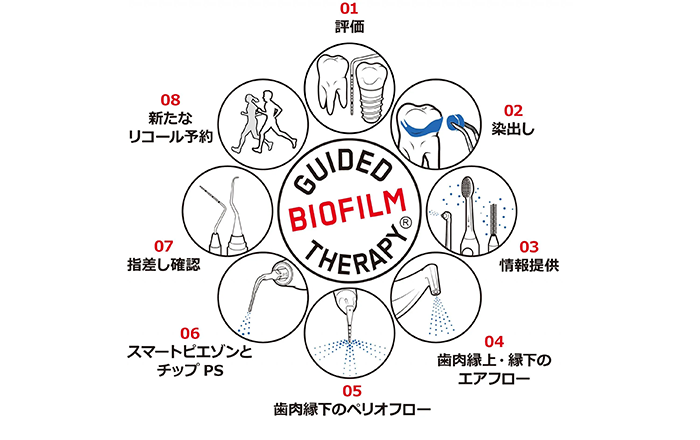 GBT(Guided Biofilm Therapy)の手順に則って患者様のお口の中を清潔な状態に導いていきます。